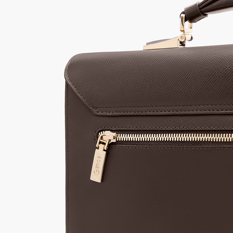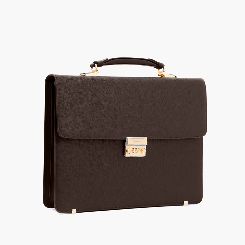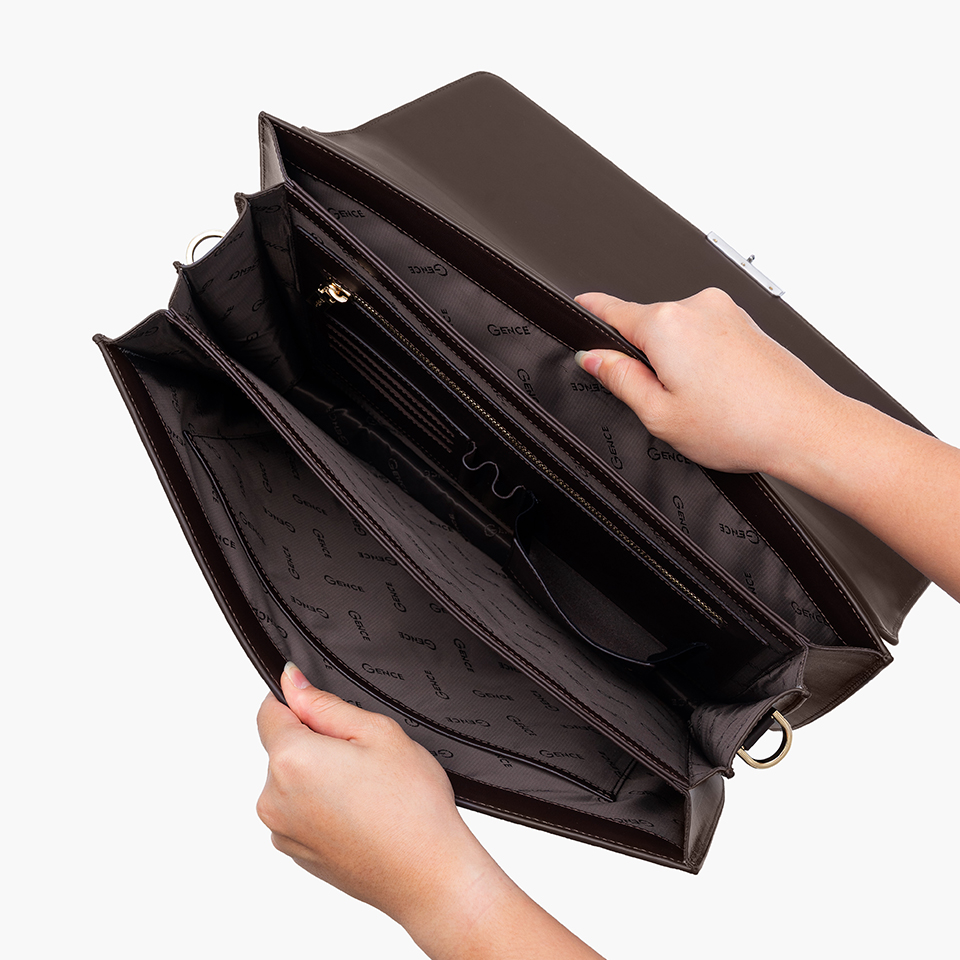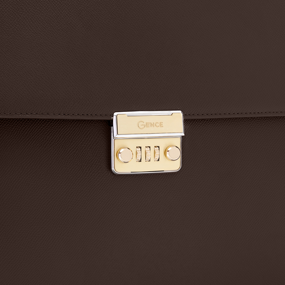 Cặp khóa số CTS26 dùng màu nâu là chủ đạo, thiết kế nắp gập lịch sự - sang trọng. Mặt trước thiết kế phần logo Gence cách điệu mạ vàng tươi sáng tạo điểm nhấn nổi bật. Quai sách sử dụng xốp mềm dày 3cm êm ái bọc da thật bên ngoài.