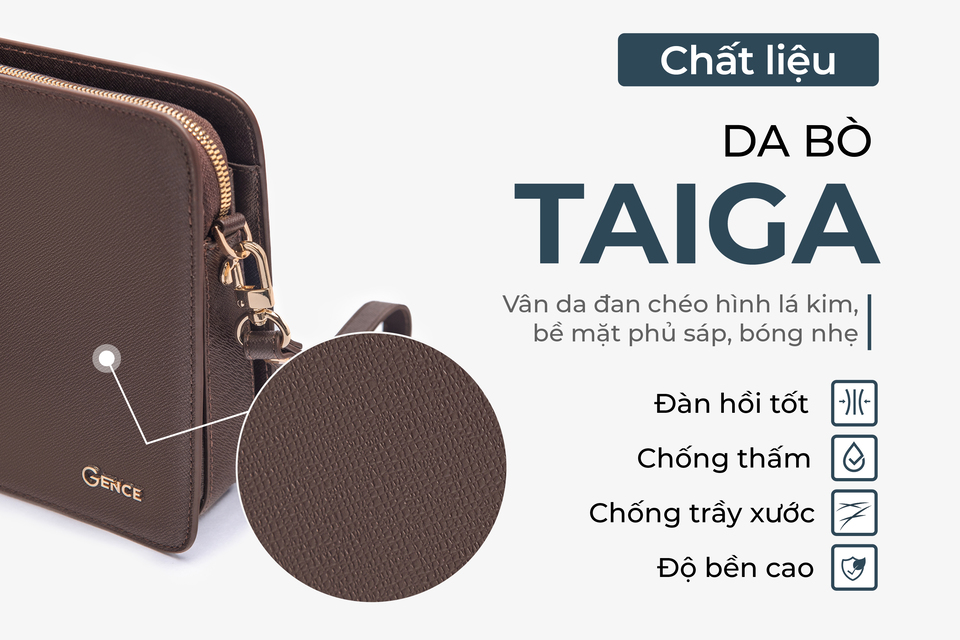 Da bò dập vân Taiga chống nước mức khá, dễ dàng vệ sinh khi dính bẩn. Đặc biệt nhờ cấu trúc da khỏe mạnh từ những con bò khỏe nhất tại Ý nên CK15 luôn giữ được form dáng chuẩn như ban đầu.