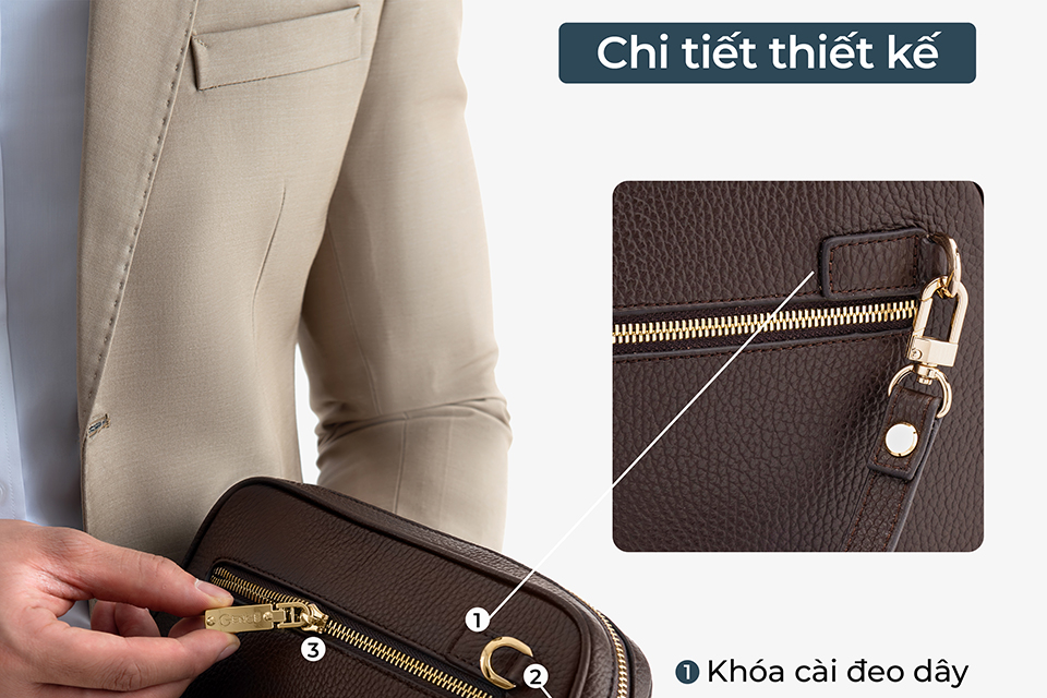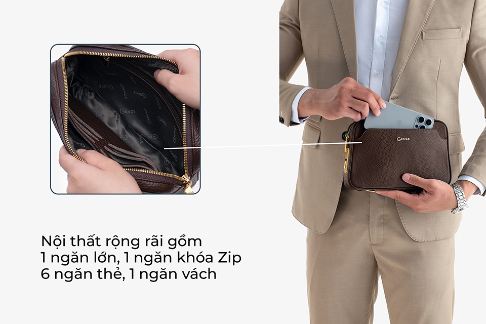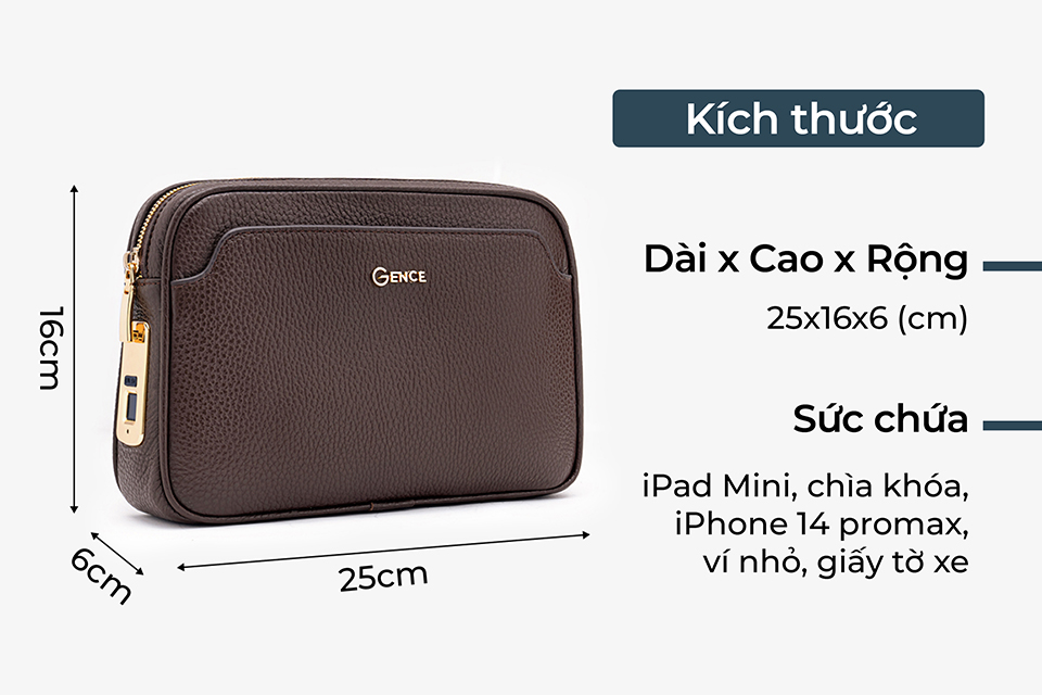 Ví cầm tay nam này có kích thước vừa phải, đủ để bạn đựng điện thoại, ví tiền, chìa khóa và giấy tờ tùy thân mà không bị chật chội. Nó giúp bạn giữ mọi thứ cần thiết gọn gàng mà không cần một chiếc túi lớn.