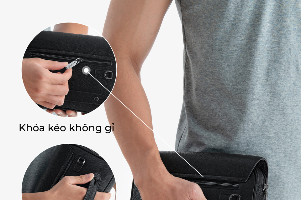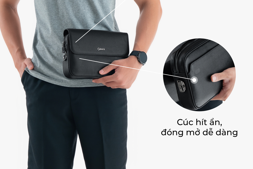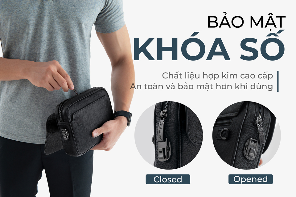 Điểm nhấn của túi cầm tay nam CK20 chính là khóa số bằng kim loại cao cấp, giúp bảo mật cao cho những vật dụng bên trong. Mặt khóa được làm bằng bạc sáng bóng, giúp tăng độ bền và đẹp lên đến 10 năm. Gence sử dụng loại dầu tra độc quyền chống gỉ và rít cho khóa số.