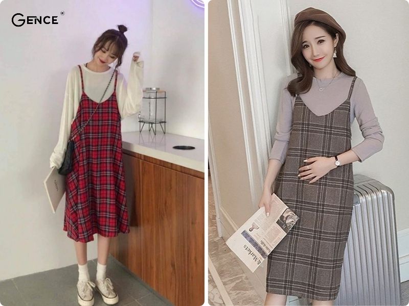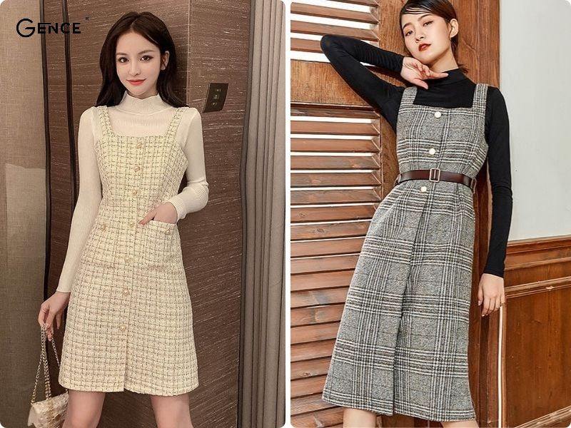Đầm yếm hai dây dạ kẻ caro tạo nên phong cách thời trang độc đáo và thu hút. Họa tiết giúp tăng sự ấn tượng và sành điệu cho chị em khi xuất hiện ở bất cứ đâu. Để đảm bảo bộ trang phục phù hợp cho mùa đông, áo thun dài được phối cùng bên trong. Chị em có thể diện bộ trang phục này đi hẹn hò, đi dạo phố, đi du lịch, đi dã ngoại,...