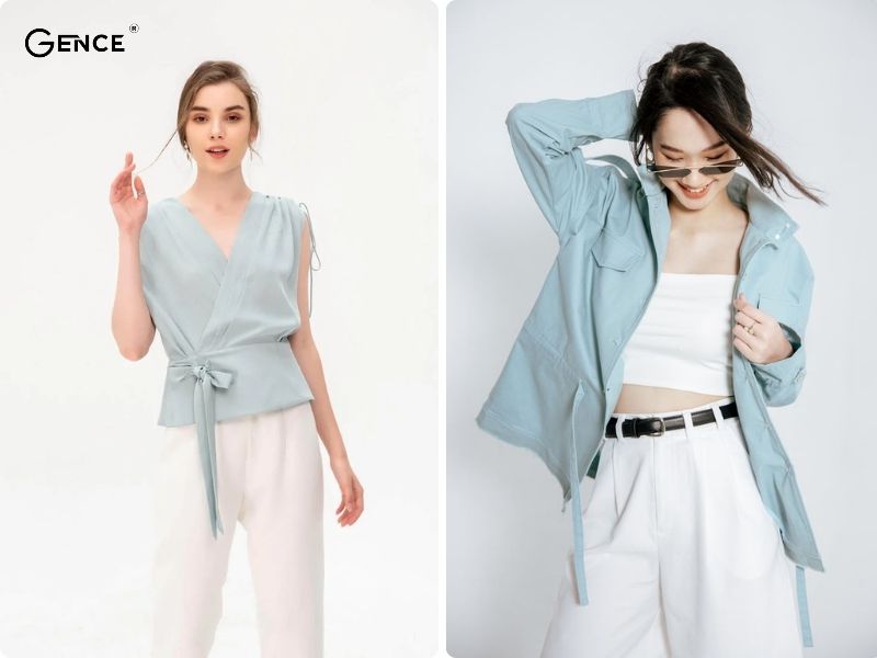 Sự kết hợp giữa màu trắng và xanh lá pastel thể hiện sự thanh lịch và nhẹ nhàng. Đây là lựa chọn lý tưởng cho những ngày hè nóng bức. Cô nàng công sở có thể lựa chọn áo kiểu cổ chữ V thắt eo màu xanh phối cùng quần âu màu trắng. Outfit vừa chỉn chu, vừa thanh lịch và tạo sức hút nơi công sở. Nếu bạn muốn bộ trang phục năng động để đi chơi, đi dạo phố,...áo sơ mi xanh khoác ngoài áo quây trắng phối cùng quần tây trắng.