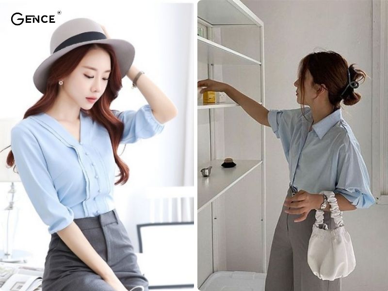 Màu xám và xanh pastel đều là những gam màu với sắc thái nhẹ nhàng. Cô nàng phối áo màu xanh pastel cùng quần màu xám thể hiện sự thanh lịch và tinh tế. Cách phối đồ này phù hợp sử dụng cho những buổi đi làm đến đi dạo phố, đi cafe cùng bạn bè,...