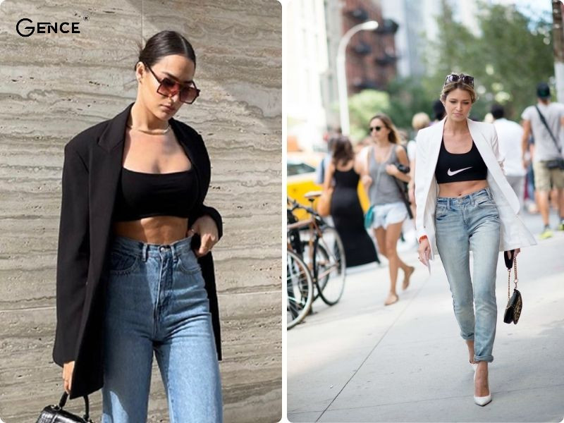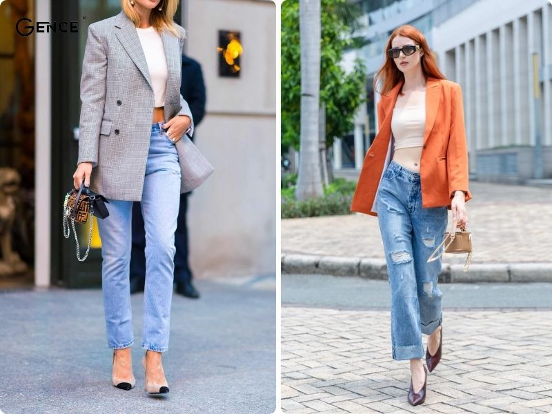 Quần jean phối áo blazer là style năng động mà vẫn đảm bảo tính lịch sự. Áo croptop với kiểu dáng ngắn giúp khoe trọn vòng eo thon gọn và làm tăng sự tươi trẻ. Những chiếc quần jean cạp cao được ưu tiên phối trong style này. Item giúp cân bằng tỷ lệ cơ thể và giúp hack dáng hiệu quả. Giày thể thao được chọn để phối cùng trang phục này thể hiện cá tính thời trang.