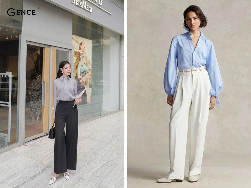 Áo sơ mi phối đồ cho người dáng quả lê với quần tây ống rộng