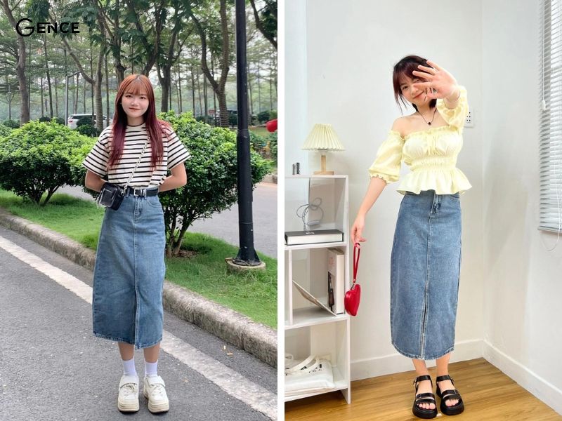 Bạn nghĩ chân váy jean xẻ tà phù hợp cho những cô nàng cá tính, năng động. Tuy nhiên khi bạn mix cùng áo kiểu hoặc áo trễ vai mang đến vẻ đẹp nữ tính, trong trẻo. Kết hợp với một số phụ kiện như vòng cổ, túi tote và giày búp bê hoặc sandal giúp bạn nổi bật hơn. Bạn có thể mặc set đồ này khi đi chơi, tham gia hoạt động ngoài trời, tụ tập bạn bè.