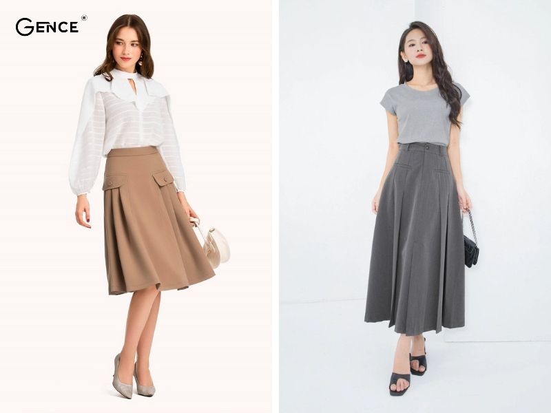 Một outfit thanh lịch phù hợp cho những cô nàng công sở có dáng quả lê không thể bỏ qua khi mix áo thun với chân váy chữ A. Để mang lại sự sang trọng cho trang phục, kết hợp áo thun cao cổ với chân váy dài mang đến cho bạn vẻ ngoài nghiêm túc.