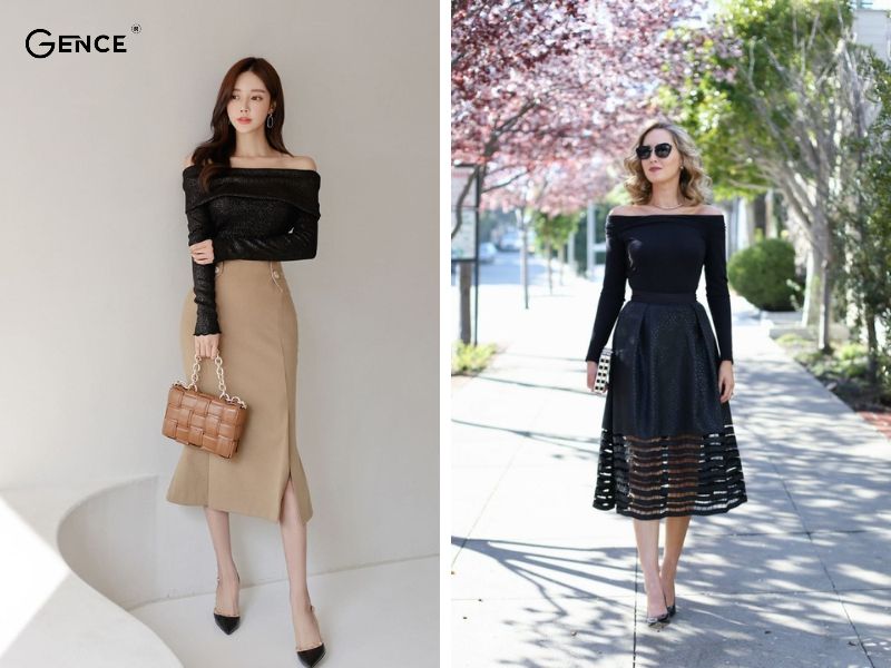 Phối đồ cho người dáng quả lê vừa quyến rũ vừa thanh lịch thì không thể bỏ qua set đồ này. Áo trễ vai giúp bạn khoe xương quai xanh và đánh lạc hướng người nhìn ở phần hông và đùi. Kết hợp cùng chân váy xếp tầng duyên dáng mang đến sự trong trẻo, thanh lịch.