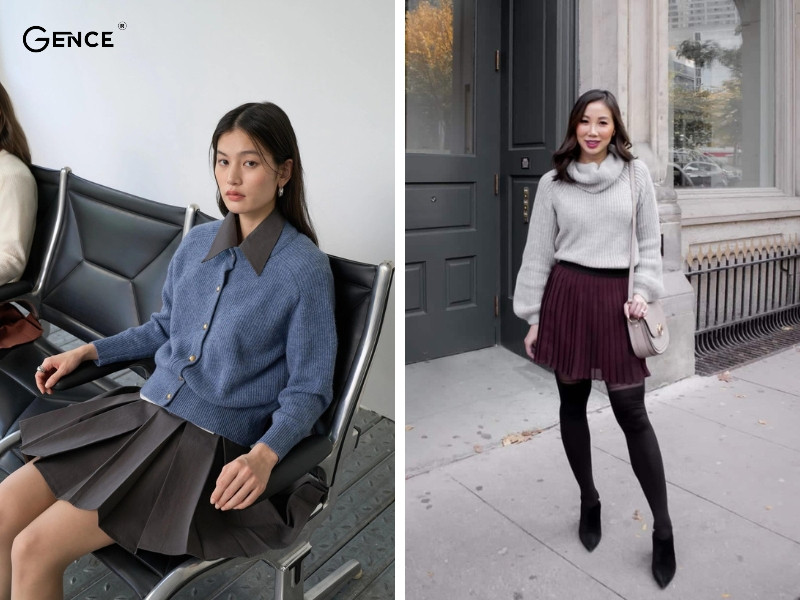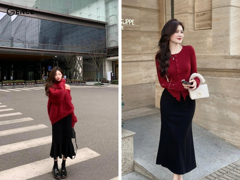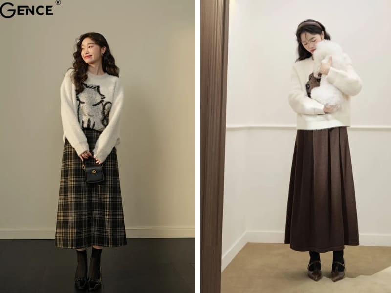 Chân váy midi là biểu tượng của sự thanh lịch và duyên dáng, khi kết hợp cùng áo len lông thỏ sẽ tạo nên vẻ ngoài vừa thời thượng vừa giữ ấm. Chọn chân váy xếp ly hoặc có họa tiết nhã nhặn để cân bằng cùng chất liệu mềm mại của áo len. Đừng quên thêm một chiếc thắt lưng nhỏ để tôn lên vòng eo, giúp tổng thể gọn gàng hơn. Giày cao gót hoặc boots cao cổ là lựa chọn lý tưởng để tăng thêm sự quyến rũ.