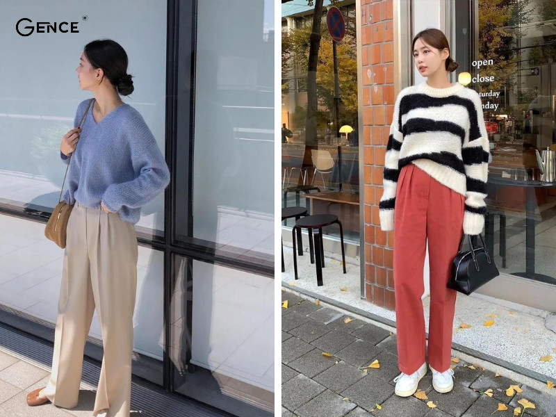 Áo len lông thỏ đi kèm cùng quần vải linen