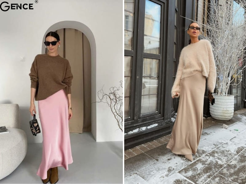 Sự mềm mại của áo len lông thỏ kết hợp với sự quyến rũ của váy body lụa tạo nên phong cách đầy sang trọng và cuốn hút. Đây là lựa chọn lý tưởng cho những buổi tiệc tối hoặc dịp quan trọng vào mùa lạnh. Hãy chọn áo len dáng crop để làm nổi bật đường cong cơ thể hoặc sơ vin nhẹ nhàng để tạo sự cân đối. Phụ kiện như vòng cổ ánh kim hoặc clutch cầm tay sẽ giúp bạn tỏa sáng hơn trong mắt mọi người.