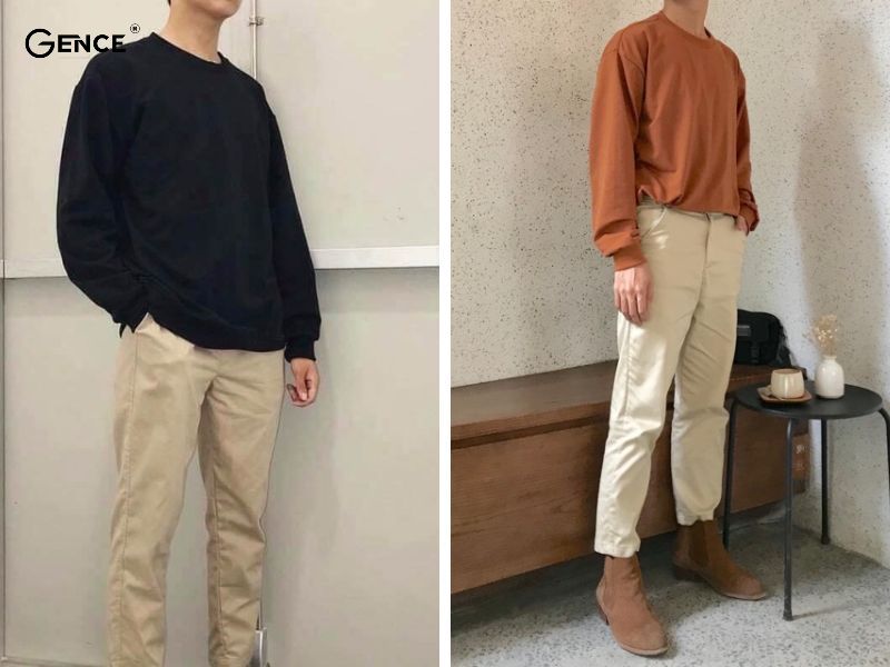Có thể chọn áo sweater có màu sắc trầm, quần kaki màu kem để tổng thể có sự cân đối.