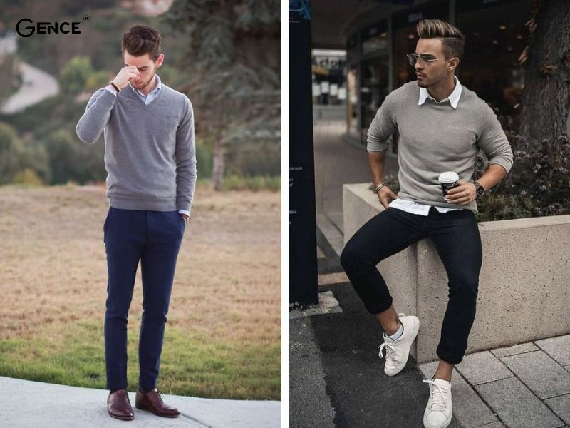 Trưởng thành, nam tính là từ dùng để diễn tả chân thực cho bộ trang phục này. Trang phục thường được thấy xuất hiện cùng quần tây là áo sơ mi. Hãy thử phối áo sweater cùng quần tây để mang đến sự sáng tạo hơn cho set đồ.