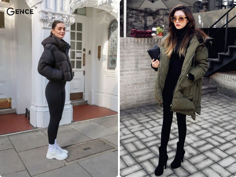 Áo phao là trang phục mùa đông giúp cô nàng giữ ấm hiệu quả khi ra ngoài. Được làm từ chất liệu chống nước và cách nhiệt, áo phao không chỉ giữ cho cơ thể bạn ấm áp mà còn bảo vệ khỏi gió lạnh và mưa phùn. Phối áo phao cùng quần legging tạo ra phong cách thời trang mùa đông thu hút. Quần legging mềm mại và ôm sát cơ thể giữ ấm cơ thể hiệu quả.