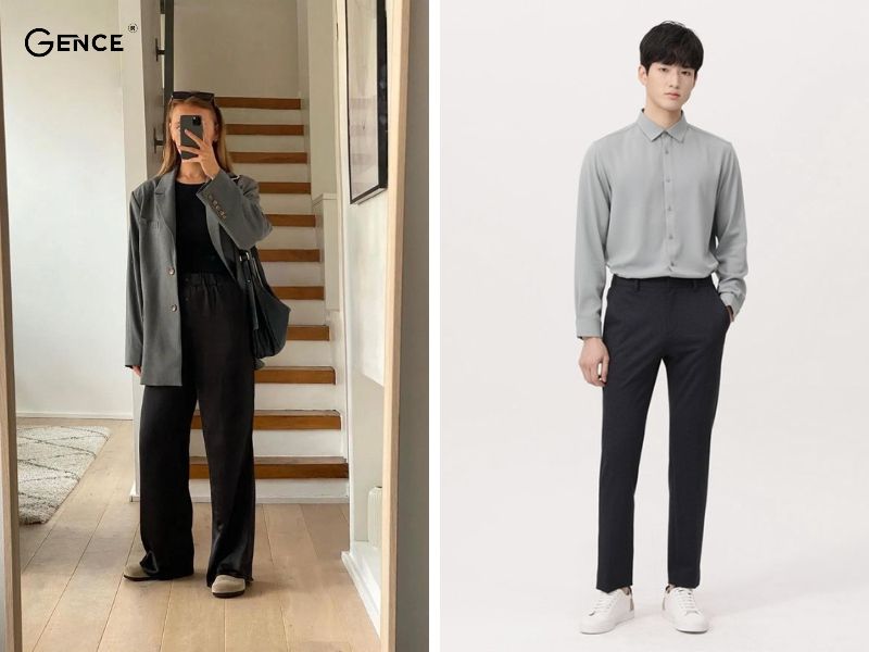 Khi kết hợp những gam màu trung tính với nhau giúp bạn mang đến phong thái sang trọng và thanh lịch. Với set đồ này phù hợp với giới mạnh đang theo đuổi sự trưởng thành. Dù bạn có đến những nơi sang trọng hay công ty hàng ngày cũng đều phù hợp. Dựa theo thời tiết mà bạn có thể lựa chọn áo polo, vest hay sơ mi khi mix cùng quần đen.