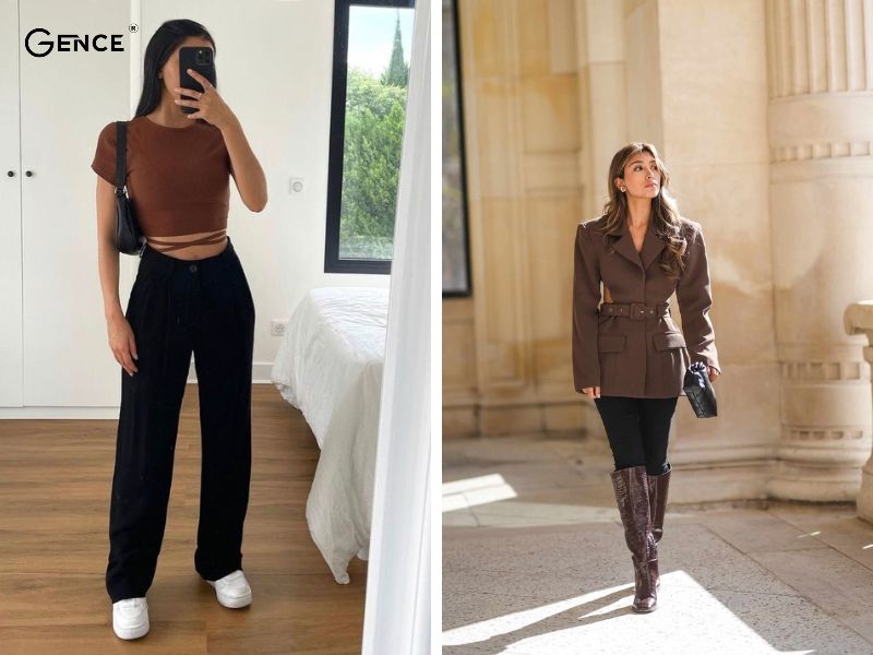 Màu nâu là sự lựa chọn hoàn hảo khi diện cùng quần đen. Màu đen mang đến sự sang trọng, mạnh mẽ trong khi đó, màu nâu gắn liền với sự bình dị, ấm áp. Hai màu này kết hợp với nhau tạo nên diện mạo trầm lặng và tinh tế. Nhưng ai yêu thích style vintage thì có thể thử quan tâm đến set đồ thời trang này.