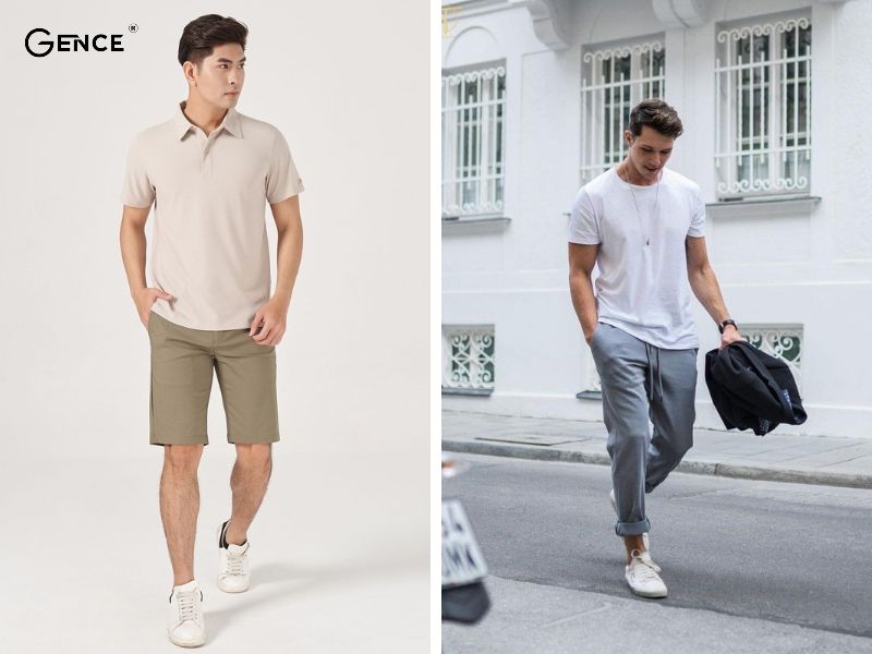 Bạn muốn xuất hiện với diện mạo trẻ trung và năng động thì hãy thử ngay set đồ áo thun, quần short và giày thể thao. Hãy lựa chọn áo thun có gam màu sáng như trắng, be hoặc xám nhạt mix với quần short đen hoặc nâu tạo sự hòa hợp.
