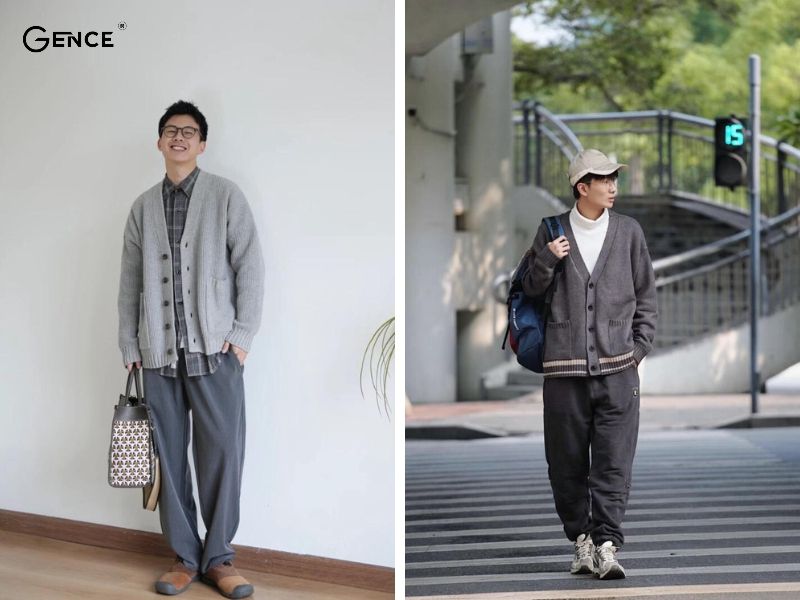 Gence gợi ý outfit thời trang basic nam với sự kết hợp độc đáo giữa cardigan và quần tối màu. Set đồ này phù hợp với những chàng trai nhẹ nhàng, hướng nội. Lựa chọn quần màu đen, xám hoặc nâu kết hợp cùng áo tone màu sáng như be, trắng hoặc nâu nhạt.