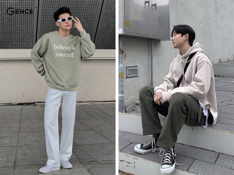 Phối quần ống rộng với sweater là một lựa chọn phổ biến trong thời trang nam basic. Bộ trang phục này thể hiện sự năng động và trẻ trung của phái mạnh. Áo sweater có thể được thiết kế với một số họa tiết nhẹ nhàng để tạo điểm nhấn cho phong cách đơn giản. Bạn cũng có thể lớp áo thun dưới áo sweater để tăng thêm sự ấm áp và thêm chiều sâu cho outfit.