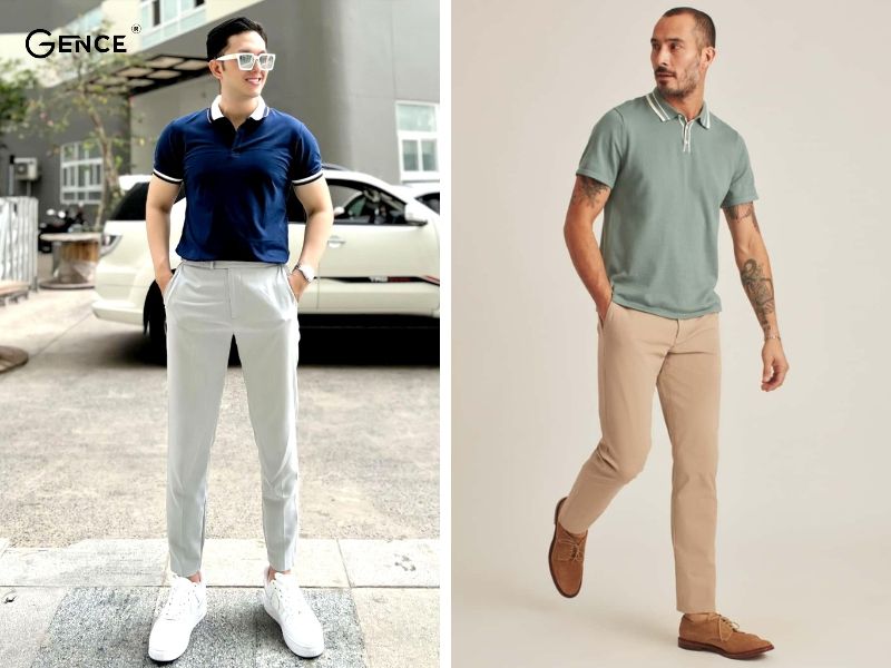 Một outfit thời trang basic nam vừa đi làm vừa đi chơi thì không thể bỏ qua cách phối áo polo với quần kaki. Bạn nên chọn những chiếc áo với tone màu sáng, nhẹ nhàng tạo sự trang nhã và vẻ ngoài thể thao. Kết hợp cùng quần kaki tối màu như nâu, xám hay xanh dương rất thích hợp.