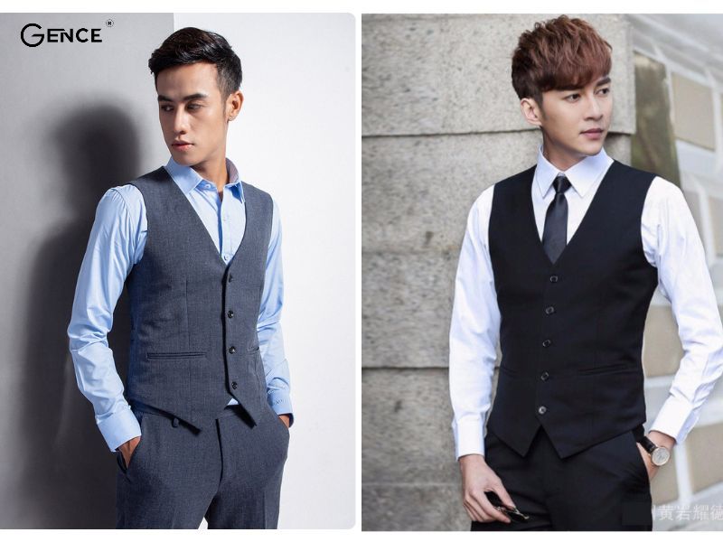 Áo vest, quần tây là cách kết hợp truyền thống khi tới dự các bữa tiệc cưới. Với sự phát triển trong phong cách thời trang, quần jean dần thay thế quần tây. Chọn chiếc áo vest có form đứng và màu sắc phù hợp với sở thích, phong cách mỗi cá nhân. Áo vest màu sáng hoặc pastel tạo ra vẻ ngoài trẻ trung, áo vest màu đậm như đen hoặc navy mang lại sự lịch lãm.