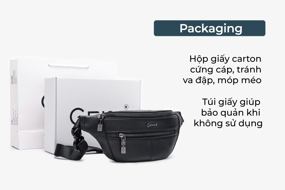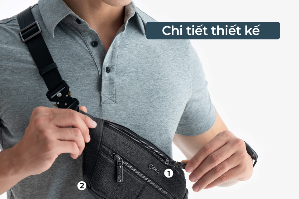 Logo Gence được in trực tiếp lên khoảng trống da giữa hai đường khóa kéo. Màu sắc sáng bóng giúp tăng độ nhận diện thương hiệu của Gence.