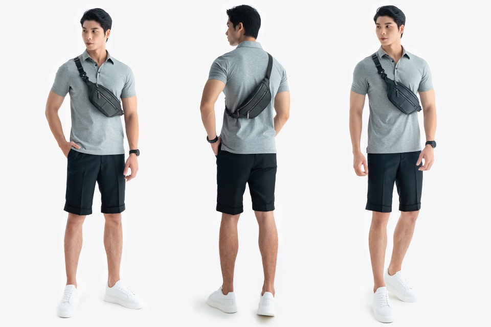 Mẫu ảnh đi làm diện áo polo xám phối cùng quần kaki màu trắng. TZ01 được trọng dụng để tăng thêm sự nam tính, chuyên nghiệp trong công việc. Đồng thời, TZ01 còn giúp họ đựng kem chống nắng, khăn ướt,...