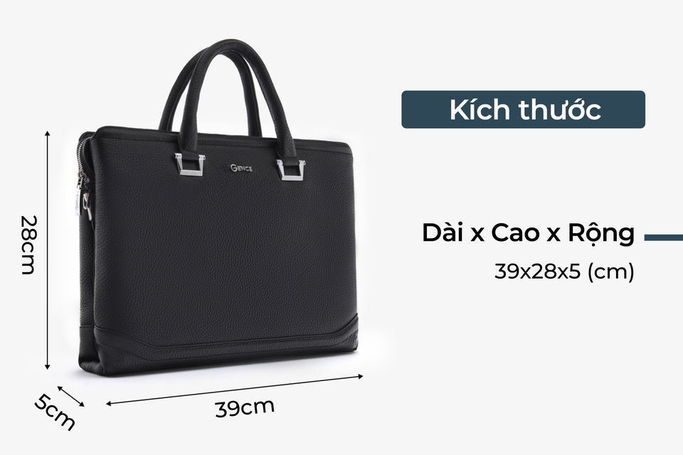 GCE14 là túi xách đựng laptop bằng da được thiết kế chuẩn Âu - Việt kết hợp. Mặt trước túi là bề mặt da nhẵn nhụi được trang trí bởi đường gờ da cách điệu nổi bật. Màu da túi đen tuyền huyền bí làm nổi bật hẳn lên logo gence sáng bóng.