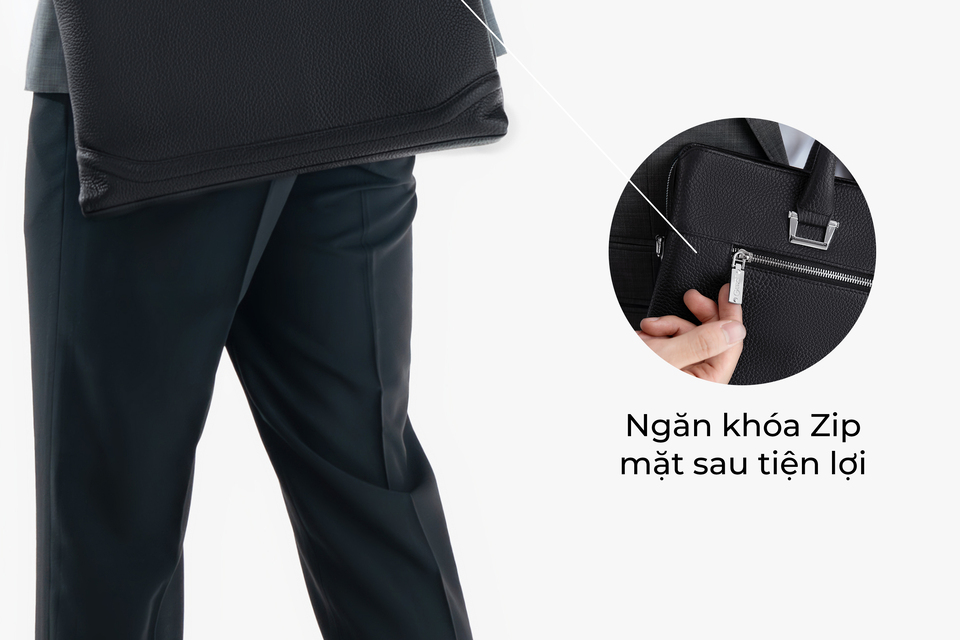 Phía sau trang bị thêm ngăn phụ mỏng để đựng giấy tờ hoặc tài liệu cần thiết. Các nhà thiết kế Việt Nam đã sử dụng tính đối xứng để tạo nên các đường kẻ hài hòa, mang tính thẩm mỹ cao ở mặt sau của túi.