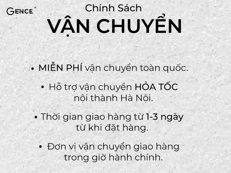 Đặc biệt, chính sách dành riêng cho khách hàng Gence rất ưu ái cho người dùng. Quý vị có thể đổi trả sản phẩm trong vòng 10 ngày nếu bị hỏng hóc. Thời gian vận chuyển nhanh chóng từ 1 - 3 ngày tùy vị trí. Hay đối với khách hàng tại Hà Nội có áp dụng giao hàng hỏa tốc. Đặc biệt, bạn có thể mang sản phẩm đồ da đến cửa hàng Gence để được vệ sinh, bảo quản và thay khóa miễn phí.
